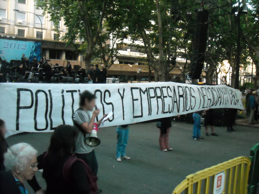 Hoy cerca de las ocho de la noche mientras en la Plaza Matriz transcurrían los festejos por el 60º aniversario de OSE un grupo de personas desplegaron en la cara de autoridades del Estado y de OSE una pancarta que decía “políticos y empresarios negocian con la vida” en repudio a todos los megaproyectos. Al grito de “¡el agua no se vende, el agua se defiende” se lanzaron volantes y se leyó la siguiente proclama: